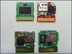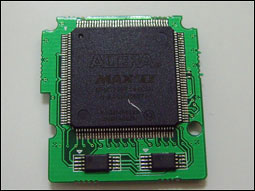 正面使用的芯片应该说质量是非常上乘的,因此也可以预见未来的游戏上不会出现什么问题。背面则是一块ALTERA的MAXII的超大芯片。下放是两块4Mb的存储芯片。(居然超过正版卡,不过从任天堂的内部资料中得知,今后将会出现8Mb存储的游戏。目前已知的4Mb存储的游戏就已经出现了。而新版本ACEKARD已经支持8Mb存档)