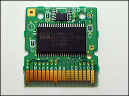 正面带有一个Japan的芯片,下面是两个很小的记忆芯片。(根据资料,每个2Mb的存储容量。因此SC-DS具备4Mb的存储芯片。)背面则是Actel韩国产的读写芯片。另外,右上角有一个电池。看来SC在技术上仍然还未能达到正版卡的完全水准?或者是这块电池另有其用?